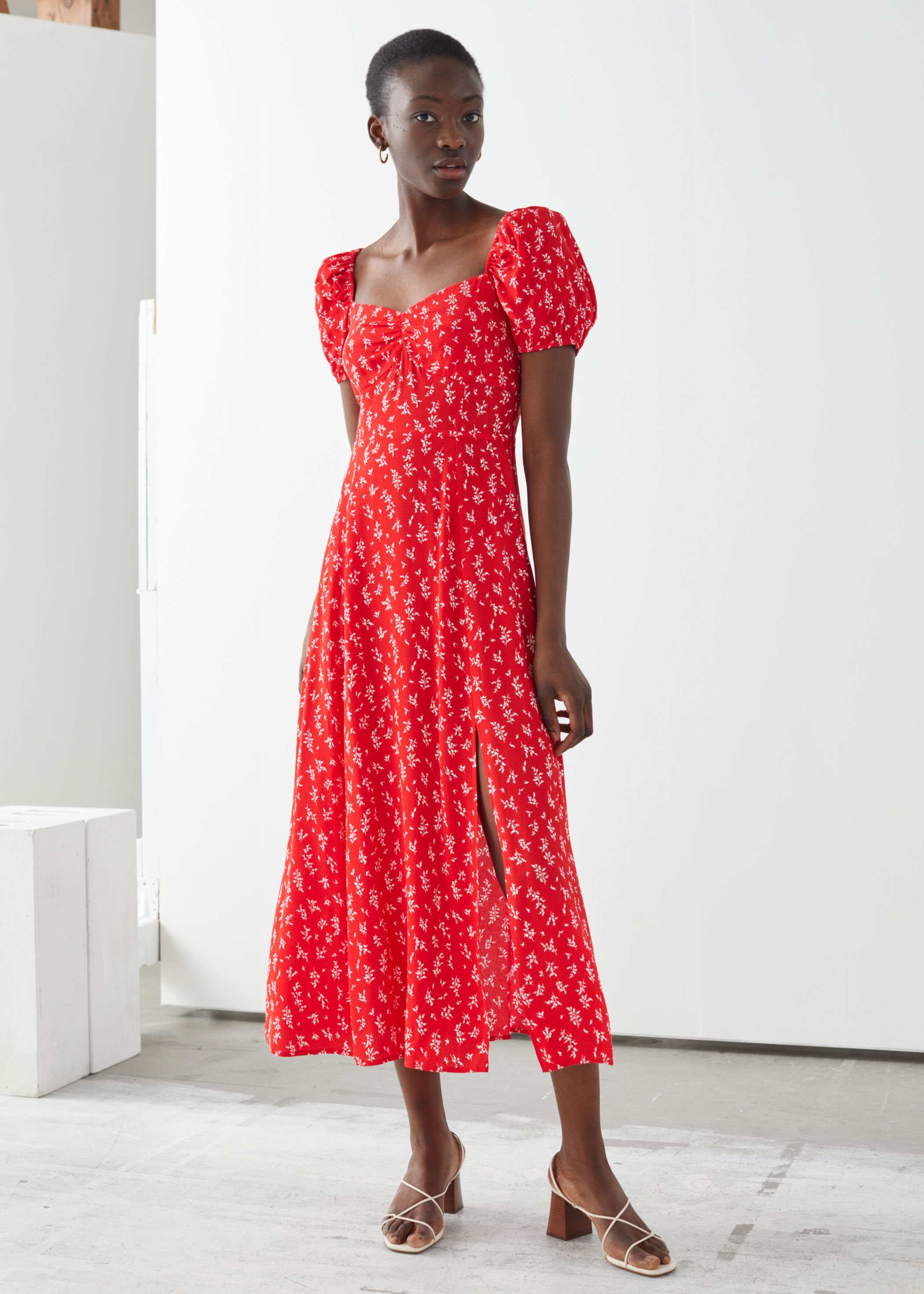 Sweetheart neckline with shirring at the bust Concealed side zipper Length of dress. Flowy midi dress finished with puff sleeves smocked bodice and side slit. Skip to main content.